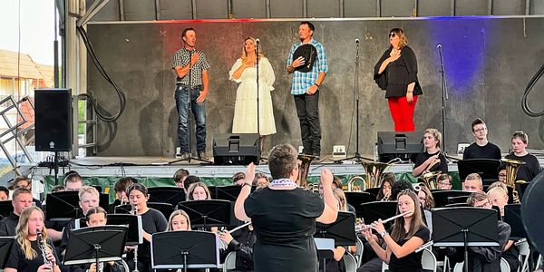Hayley Winslow (trumpet), Mike Winslow (trombone), Audrey Wood (clarinet), and Jared Nicholson (trumpet) are all members of The Band Directors Marching Band. They are also colleagues at the Washington County School District in St. George City, Utah. The directors filed this report about their SERVICE THROUGH MUSIC project: