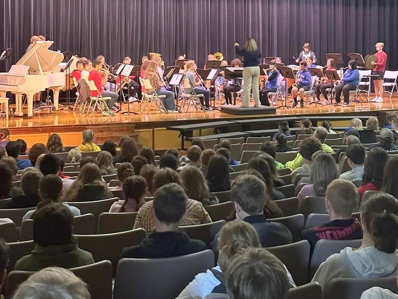 The band at Tommie Kunst Junior High School is led by Jessica Husselstein who plays piccolo in The Band Directors Marching Band. Congratulations to the Tommie Kunst Junior High School Band for serving the community with music!